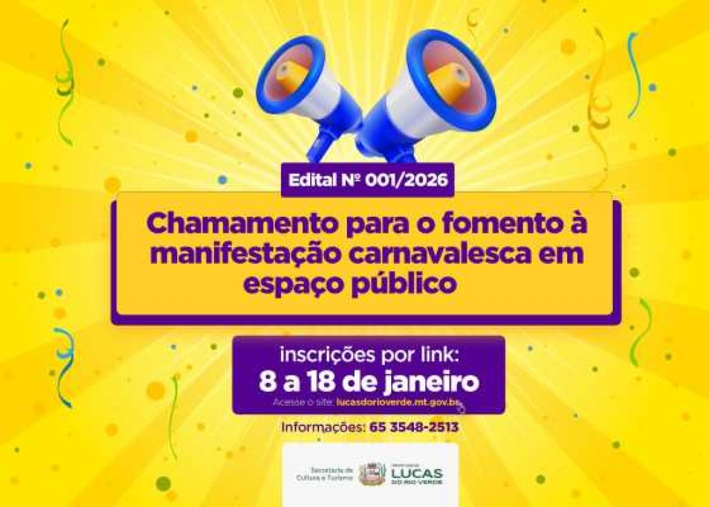 A Secretaria Municipal de Cultura e Turismo de Lucas do Rio Verde abre inscrições para o Edital nº 001/2026, voltado ao fomento de manifestações carnavalescas em espaços públicos do município.