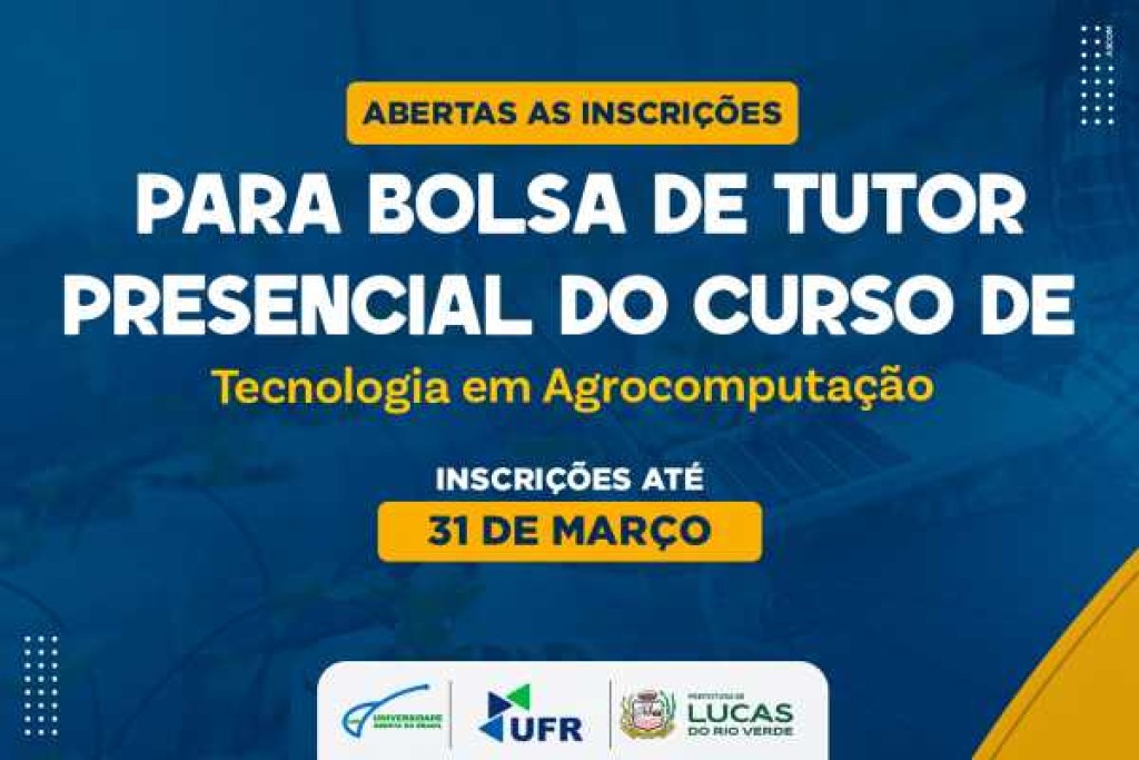 A Universidade Aberta do Brasil (UAB), polo de Lucas do Rio Verde, em parceria com a Universidade Federal de Rondonópolis (UFR), está com inscrições abertas para vagas remanescentes do processo seletivo de bolsistas interessados em atuar como tutor presencial no curso superior de Tecnologia em Agrocomputação. A inscrição é gratuita e deve ser realizada até o dia 31 de março.