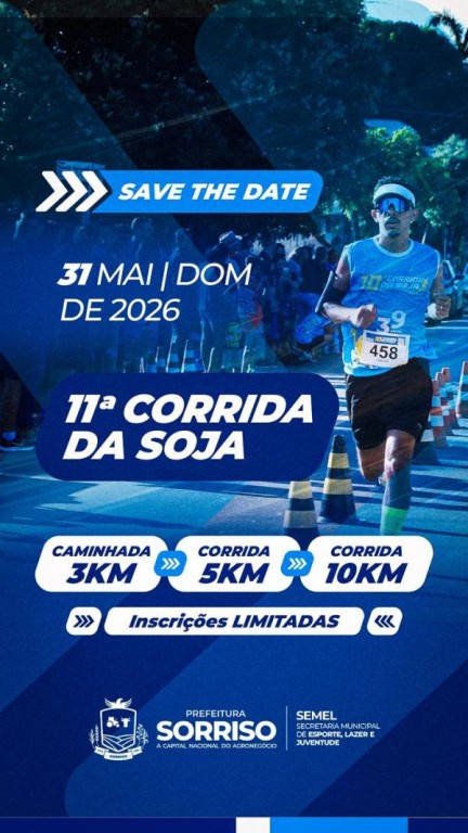 Com premiação que deve ultrapassar R$ 100 mil e vagas limitadas por modalidade, a 11ª Corrida da Soja será realizada no dia 31 de maio, em Sorriso. A largada está marcada para as 6h, na Praça das Fontes. As inscrições começam na próxima segunda-feira (30), às 11h, pelo site da Agito Esportes (www.agitoesportes.com.br).