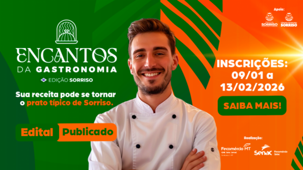 As inscrições para eleger o prato típico de Sorriso estão abertas e vão até o dia 13 de fevereiro, podendo ser feitas pelo site: https://www.mt.senac.br/pages/encantos-sorriso/. A magia, o sabor e a regionalidade transformam o turismo gastronômico por onde passa o concurso Encantos da Gastronomia do Serviço Nacional de Aprendizagem Comercial em Mato Grosso (Senac-MT) e sua próxima ocorre na Capital do Agronegócio, com parceria da Prefeitura e da Câmara Municipal.